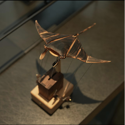 This handcrafted piece, available in two styles: a gear-shaped mechanical base and a delicate black mahogany base, is primarily crafted from beech and North American black walnut and features a mechanical structure. The manta ray's entire body cannot be mechanically modified, and its streamlined surface is entirely handcrafted. Its movement angles are impossible to replicate. Each piece is deeply experimental. The dark brown back, painted in acrylic paint, sways gracefully in the sunlight, reflecting a subtle golden-brown glow, evoking a sense of uniqueness, mystery, power, and freedom. Manta rays freely traverse the vast ocean, their massive size yet agile movements symbolizing the pursuit of freedom and their hidden power. Due to their unique appearance and habitat, such as the deep sea, which is difficult to fully understand, they are imbued with connotations of mystery and uniqueness, representing a personality that defies conventional definitions.